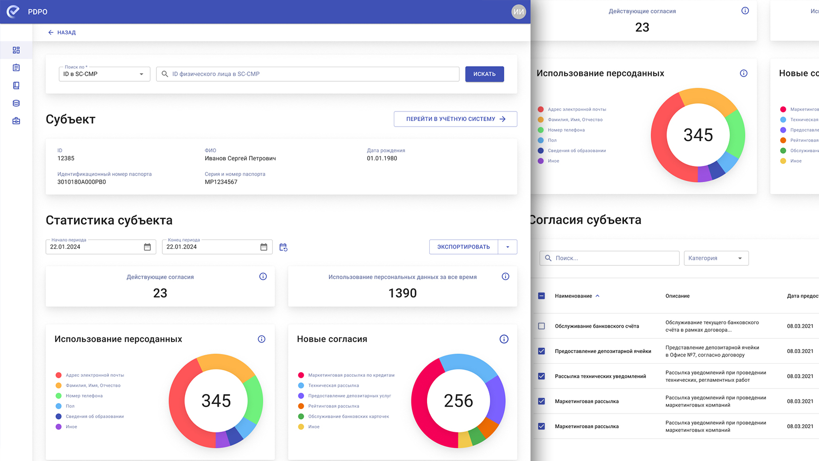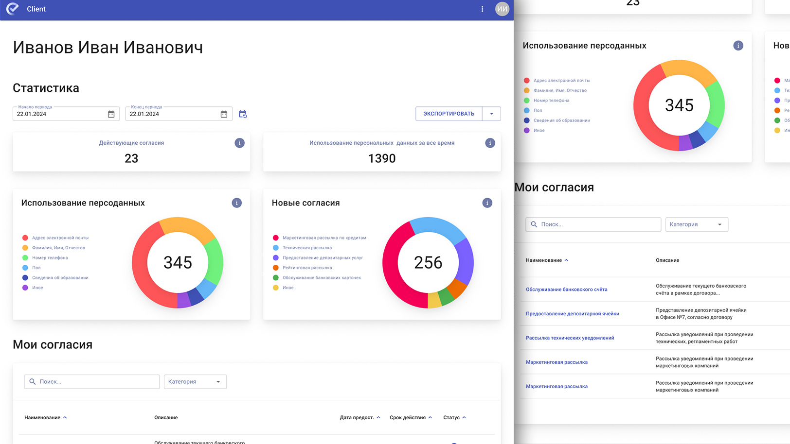 - Генерация отчетов и просмотр статистики по пользователям, типам согласий и др., в том числе и для предоставления уполномоченным органам